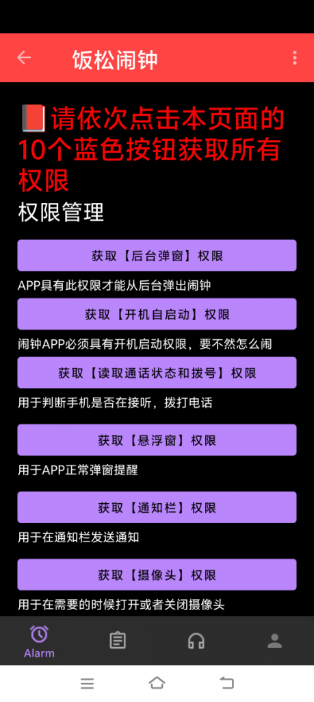 - 首次打开饭松闹钟 APP,自动进入权限管理页面;