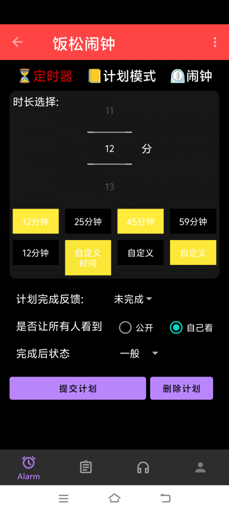 饭松闹钟 APP 的定时器功能,是一款专为专注、学习、工作设计的倒计时工具,支持预设时长和自定义时间,并搭配计划完成反馈与情绪状态记录,帮你追踪任务进度,同时记录每次完成后的心情感受,打造 “专注 + 复盘” 的闭环体验。
