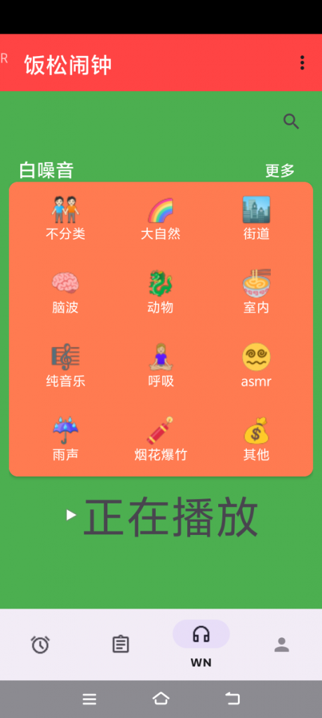 - 打开饭松闹钟 APP,点击底部导航栏的「WN(耳机图标)」,进入白噪音页面;